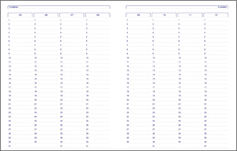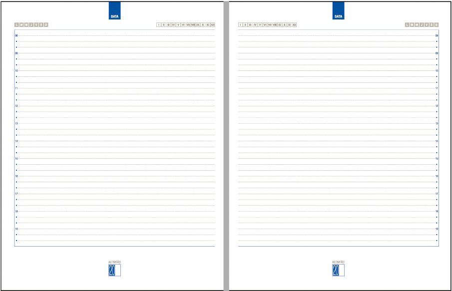 Agenda nedatata A4 (21x27cm) cu 232 de pagini (224 + 8 atlas). Hartie offset, alba, 70g/mp. Imprimare: 2 culori (albastru, gri), atlas 8 pagini policromie, forzat gri. Finisare: cusuta, legata. Coperti buretate, coperta 1 cusuta, colturi perforate, semn de carte gri, banda capital alba. Personalizare coperta: folio sau timbru sec. Personalizare interior: 2-4 pagini cretata mata alba 130 g/mp.