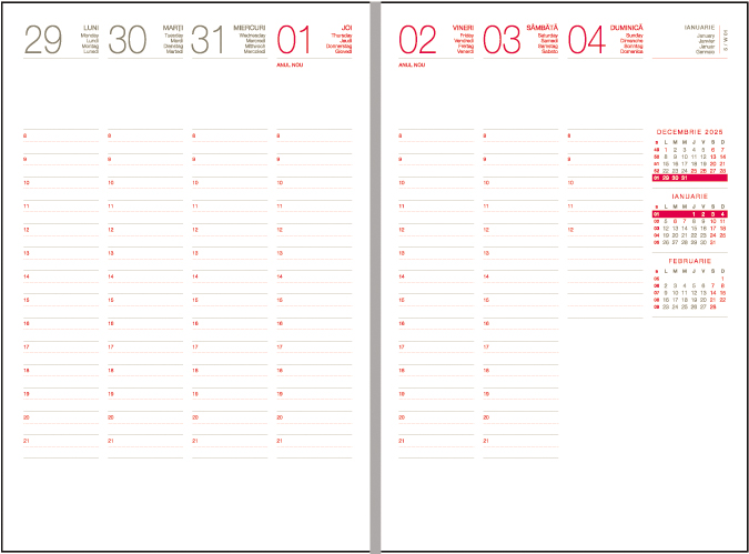 Agenda saptamanala A5 (16×23.5cm) cu 152 de pagini (144 pagini, 8 atlas). Hartie offset, alba, 70g/mp. Imprimare: 2 culori (rosu, gri), atlas 8 pagini policromie, forzat gri. Finisare: cusuta, legata. Coperti buretate, coperta 1 cusuta, semn de carte gri, banda capital alba. Personalizare coperta: folio sau timbru sec. Personalizare interior: 2-4 pagini cretata mata alba 130 g/mp.