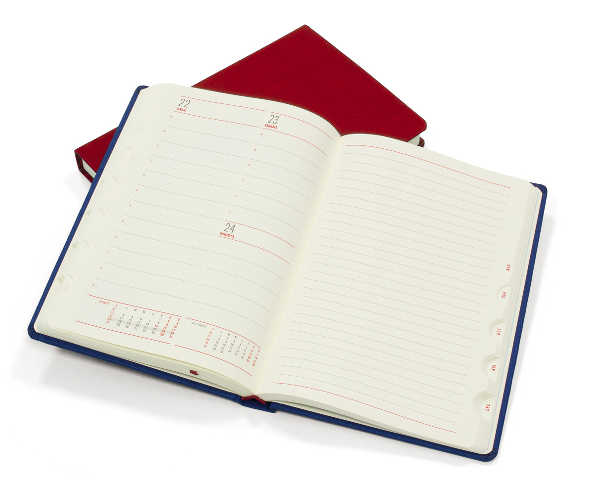 Agenda zilnica A5 (16×23.5cm) cu 400 de pagini (392 + 8 atlas). Hartie offset, ivoire, 70g/mp. Imprimare: 2 culori (rosu, gri), atlas 8 pagini policromie, forzat ivoire. Finisare: cusuta, legata. Stantata tip index. Coperti buretate, semn de carte rosu, banda capital rosie. Personalizare coperta: folio sau timbru sec. Personalizare interior: 2-4 pagini cretata mata alba 130 g/mp.