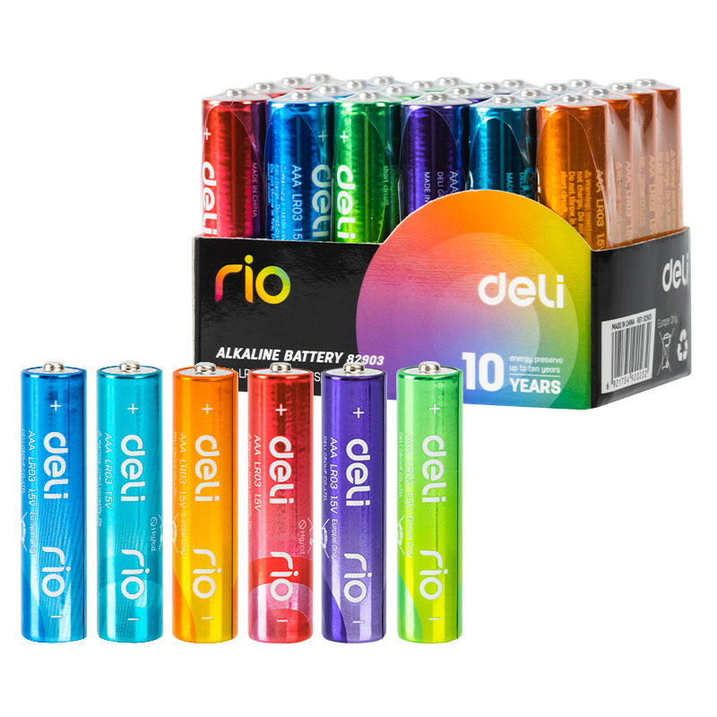 Set de 4 baterii R3(AAA) colorate, alcaline Deli. Fara mercur si cadmiu. Voltaj: 1.5V. Material: zinc, dioxid de mangan.