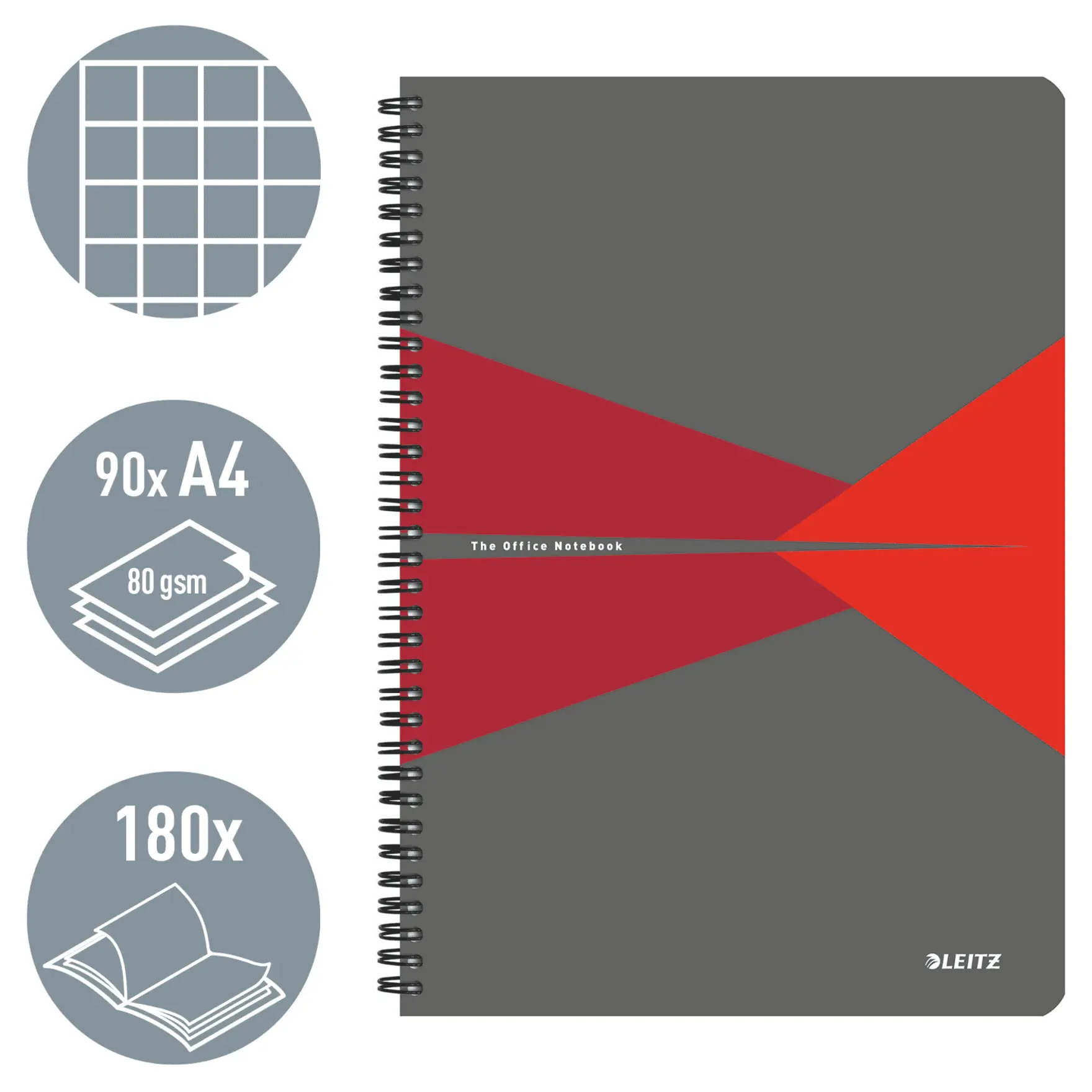 Caiet de birou Leitz Office, PP, certificare FSC, reciclabil, A4, 90 coli, cu spira, matematica. Solutia perfecta pentru uz zilnic. 90 de file din hartie de calitate superioara, 80 g/m². Usor de rasfoit, datorita deschiderii 360°. Coperta din polipropilena.
