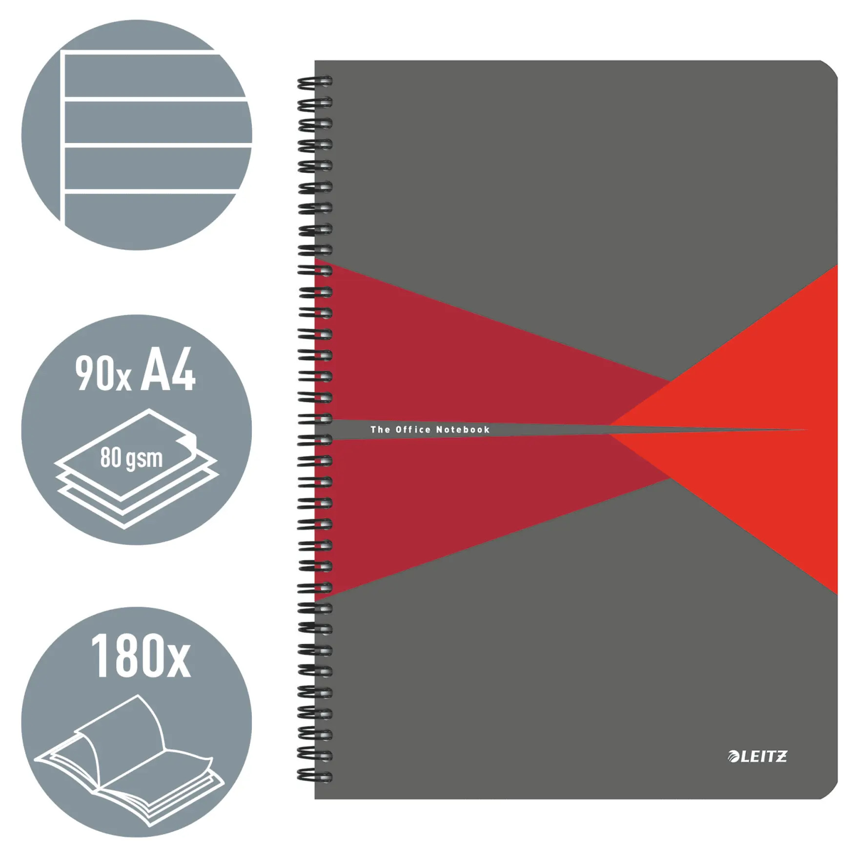 Caiet de birou Leitz Office, PP, certificare FSC, reciclabil, A4, 90 coli, cu spira, linii. Solutia perfecta pentru uz zilnic. 90 de file din hartie de calitate superioara, 80 g/m². Usor de rasfoit, datorita deschiderii 360°. Coperta din polipropilena.