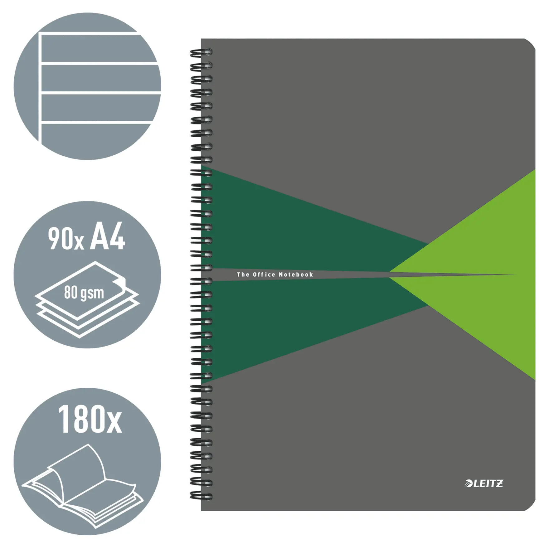 Caiet de birou Leitz Office, PP, certificare FSC, reciclabil, A4, 90 coli, cu spira, linii. Solutia perfecta pentru uz zilnic. 90 de file din hartie de calitate superioara, 80 g/m². Usor de rasfoit, datorita deschiderii 360°. Coperta din polipropilena.