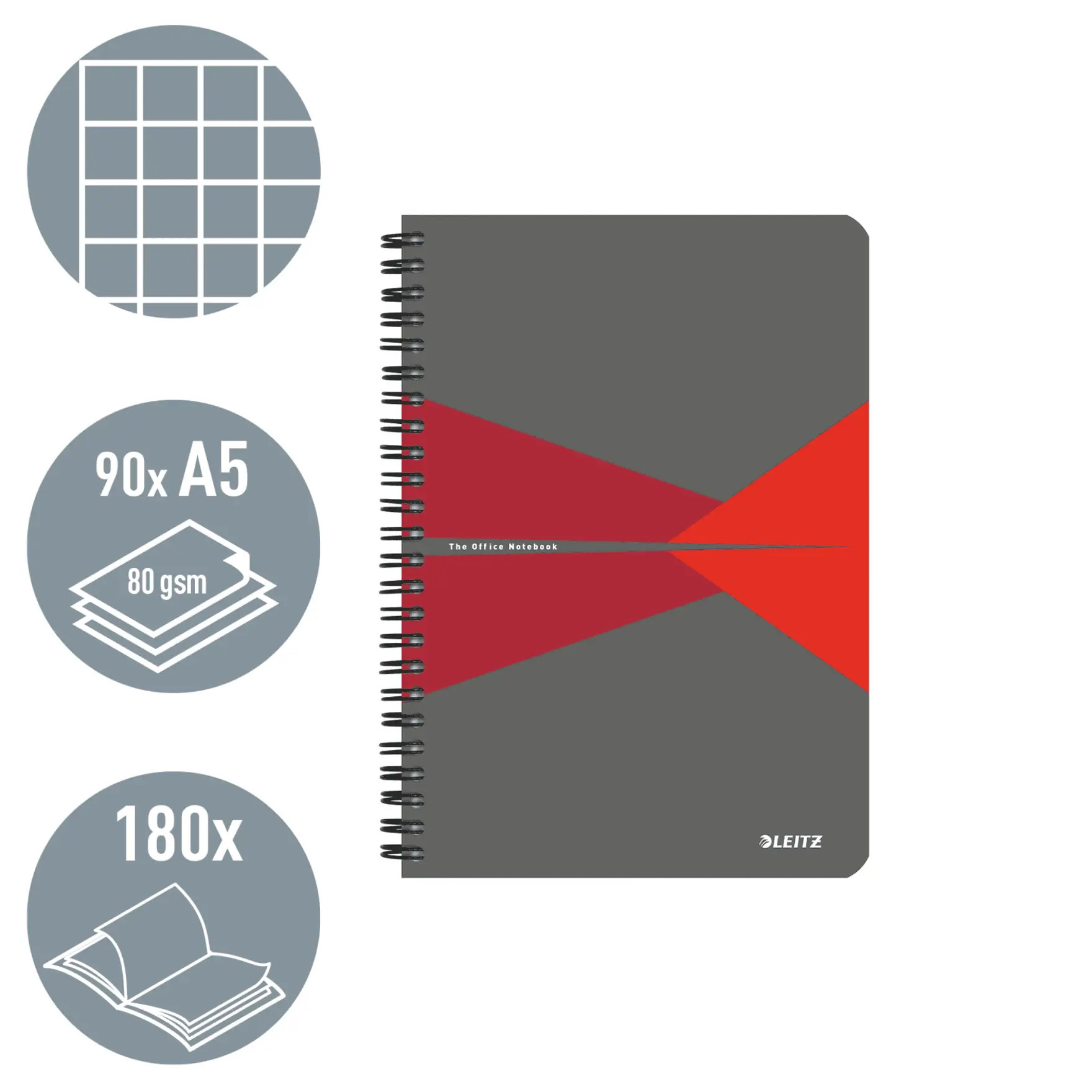 Caiet de birou Leitz Office, PP, certificare FSC, reciclabil, A5, 90 coli, cu spira, matematica. Solutia perfecta pentru uz zilnic. 90 de file din hartie de calitate superioara, 80 g/m². Usor de rasfoit, datorita deschiderii 360°. Coperta din polipropilena.
