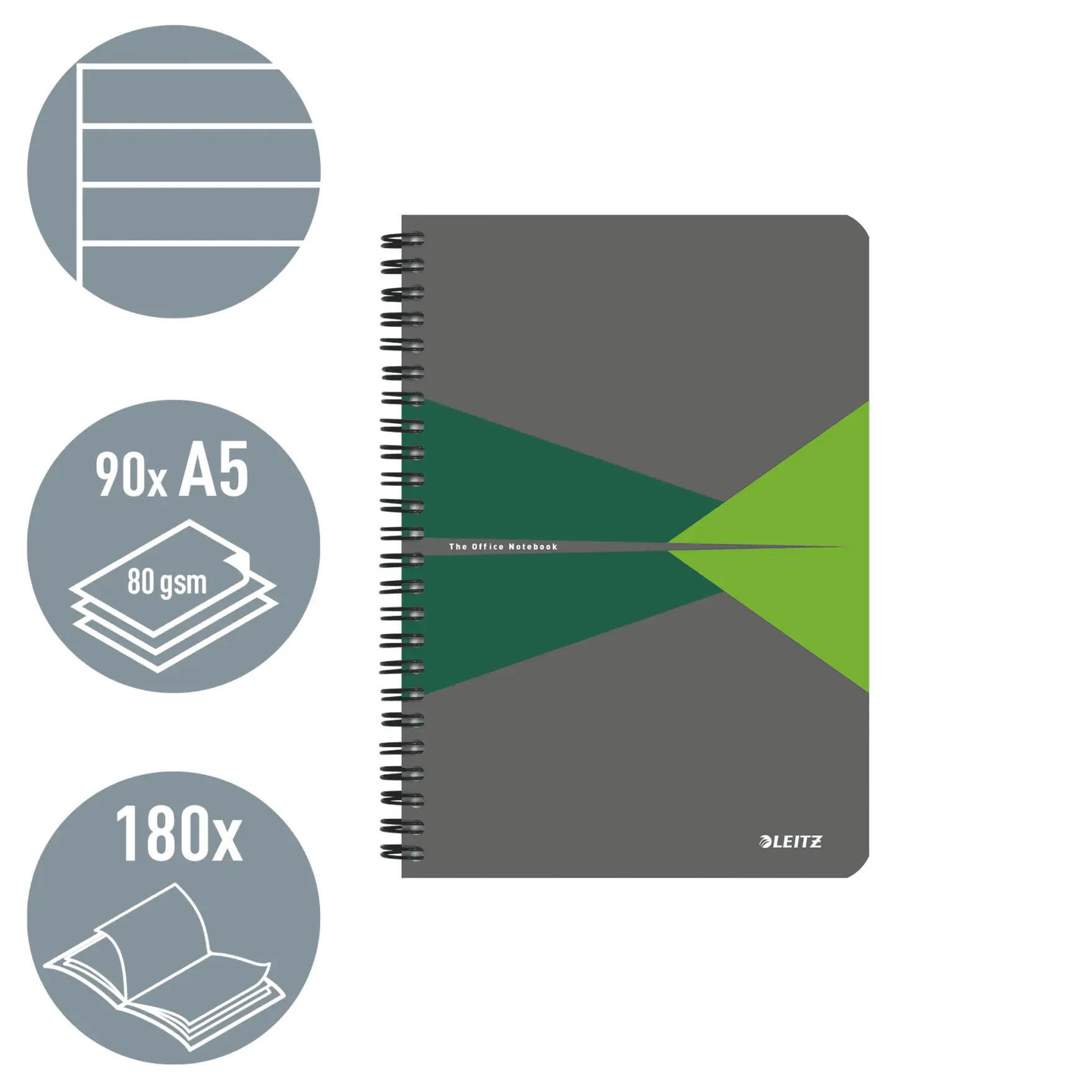 Caiet de birou Leitz Office, carton laminat, certificare FSC, reciclabil, A5, 90 coli, cu spira, linii. Solutia perfecta pentru uz zilnic. 90 de file din hartie de calitate superioara, 80 g/m². Usor de rasfoit, datorita deschiderii 360°. Coperta din carton laminat.
