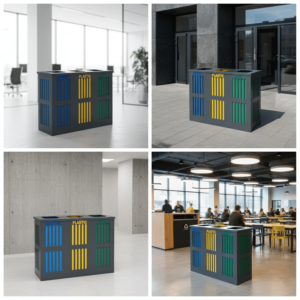 Este o soluție completă pentru spațiile care urmăresc un sistem eficient de reciclare, menținând un aspect ordonat și profesional.