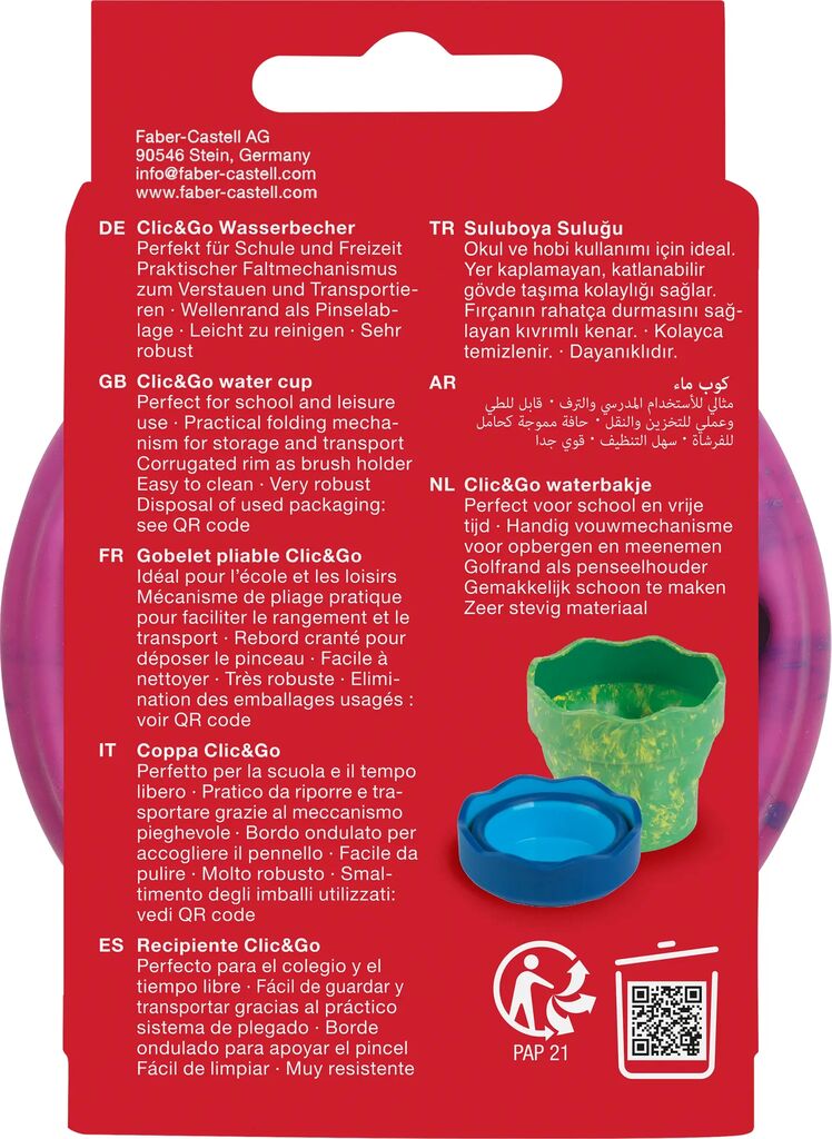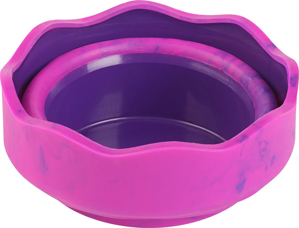 Cutia pentru apa click-go  roz Unicorni   Faber-Castell are un mecanism inovator de pliere care va permite sa o depozitati intr-un mod economisind spatiu atunci cand nu este utilizata. In plus, materialul folosit este potrivit pentru masina de spalat vase, ceea ce face curatarea o usoara. Design ergonomic pentru depozitare simpla. Marginea ondulata serveste drept suport practic pentru pensule, astfel incat sa fie mereu la indemana.