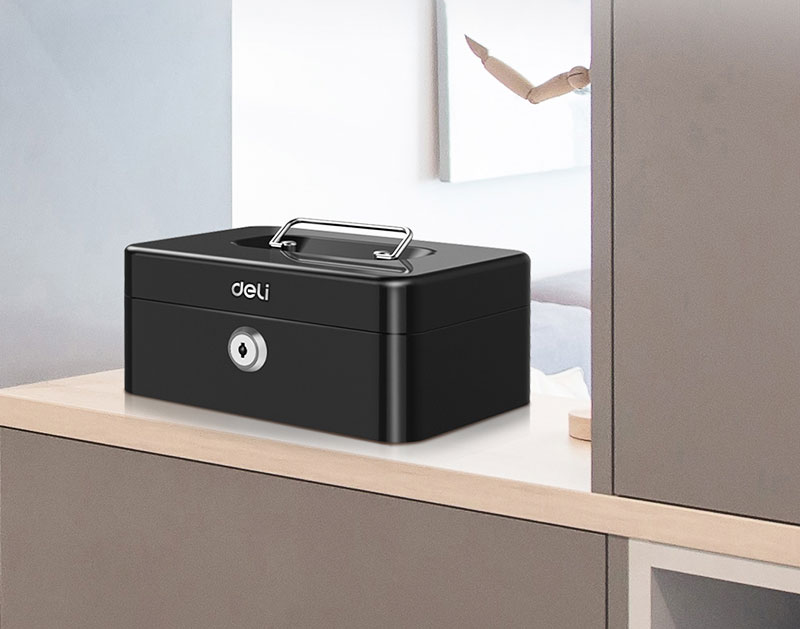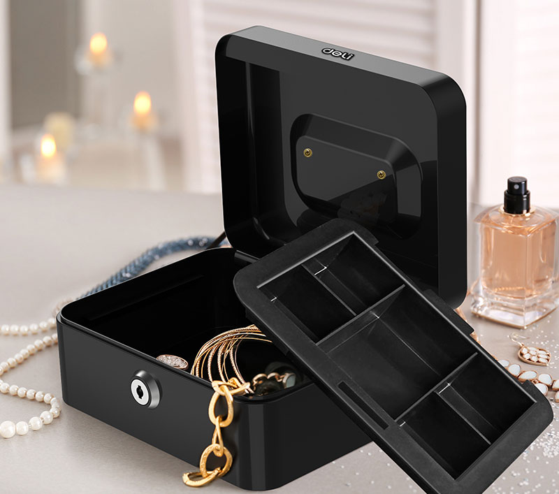 Cutie de valori Deli din metal durabil cu metoda de deblocare cu 2 chei, depozitare compartimentata. Include o tavita cu 5 fante detasabila. Colturi rotunjite pentru mai mare siguranta, maner pentru transport, cu un design special. Cutie pentru depozitare de diverse produse mici: bijuterii, documente, bani. etc. Dimensiuni: 9 x 20 x 16 cm.