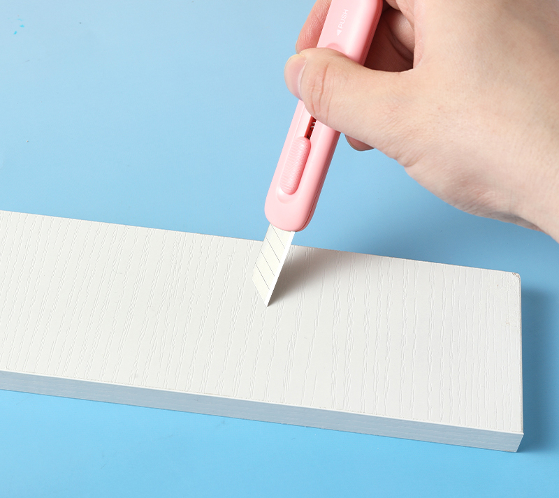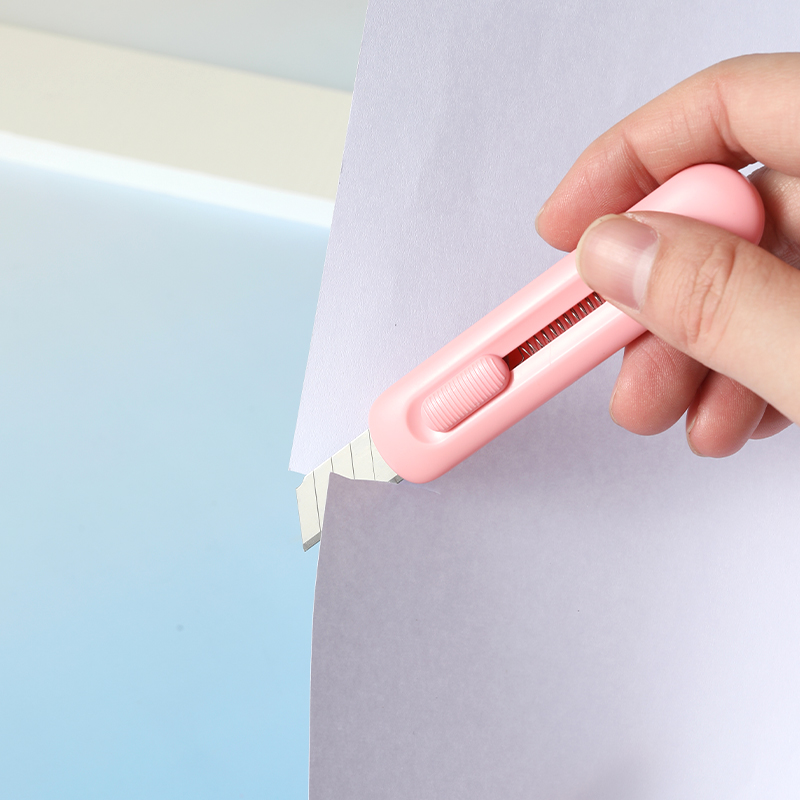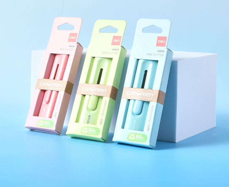 Cutter mini Deli din plastic reciclat, ambalat intr-o cutie de carton certificata FSC. Lama ascutita, retractabila, din otel. Protectie, sistem de blocare. Portabil si ergonomic pentru o prindere confortabila. Dimensiuni: 90 x 20 x 10 mm.