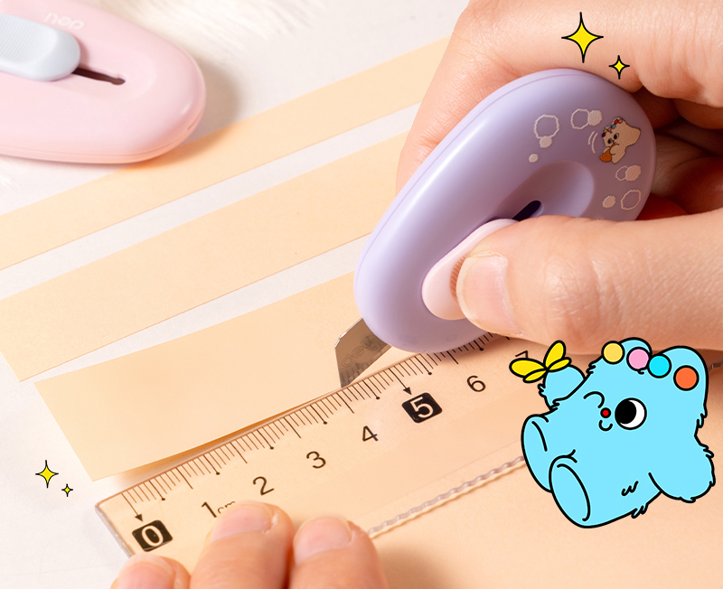 Cutter cu design vesel, compact. Protectie, sistem de blocare. Lama ascutita, retractabila, rezistenta din aliaj. Forma rotunda. Culori pastel asortate. Dimensiune: 0.5 x 9 x 35 mm.