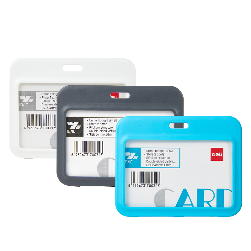 Ecuson orizontal din plastic rigid, cu 2 fete, prevazut cu clips si snur textil. Spate rabatabil pentru acces usor. Culori asortate. Dimensiune: 100 x 80 mm (card interior – 54 x 86 mm).