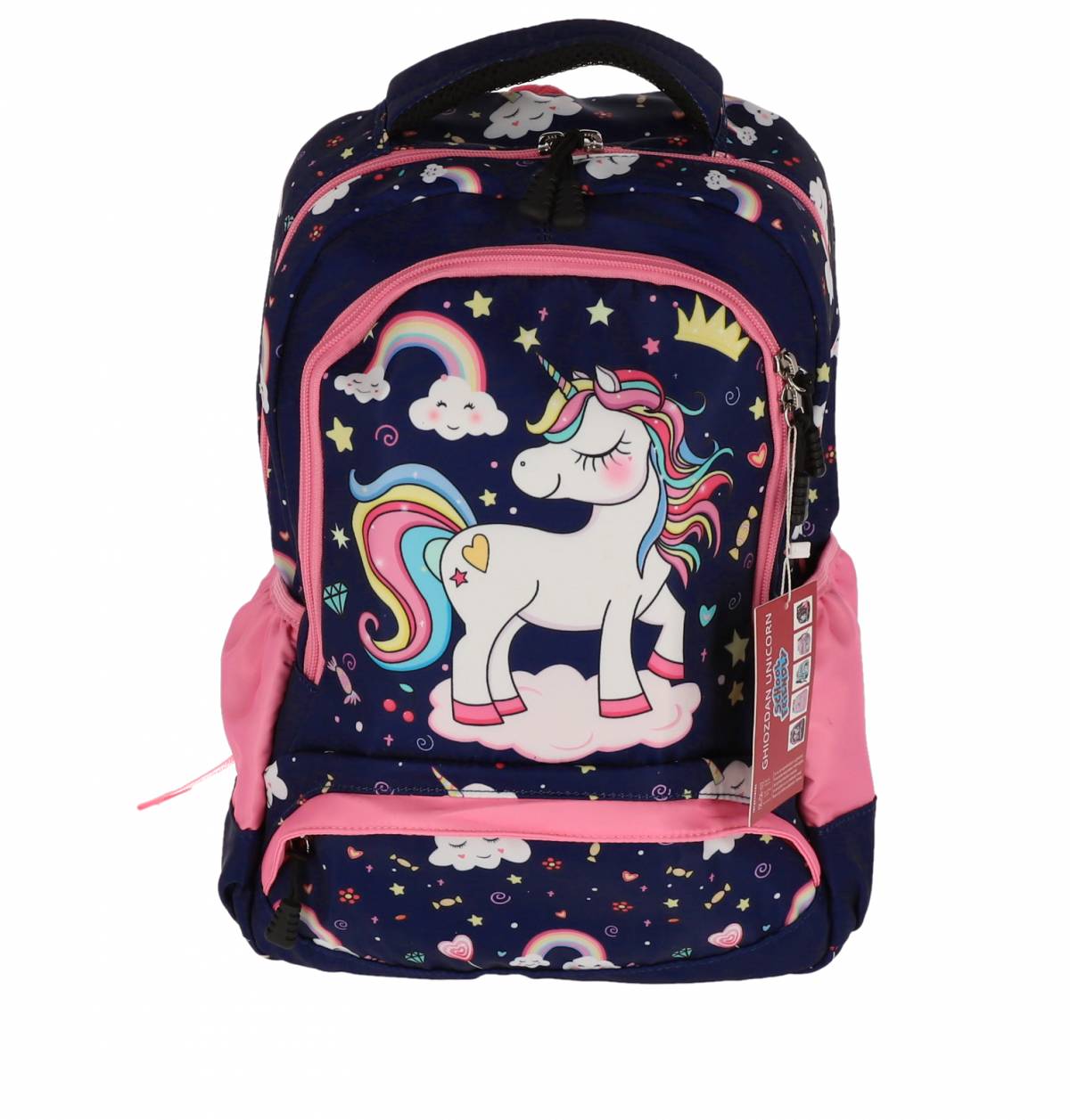 Ghiozdan pentru clasa pregatitoare de la Pigna cu 3 fermoare, imprimat cu unicorni. Material rezistent. Bretele ajustabile. Buzunare laterale. Maner de prindere. Dimensiuni: 38 x 29 x 13 cm. Volum: 15 L. Greutate: 800g.