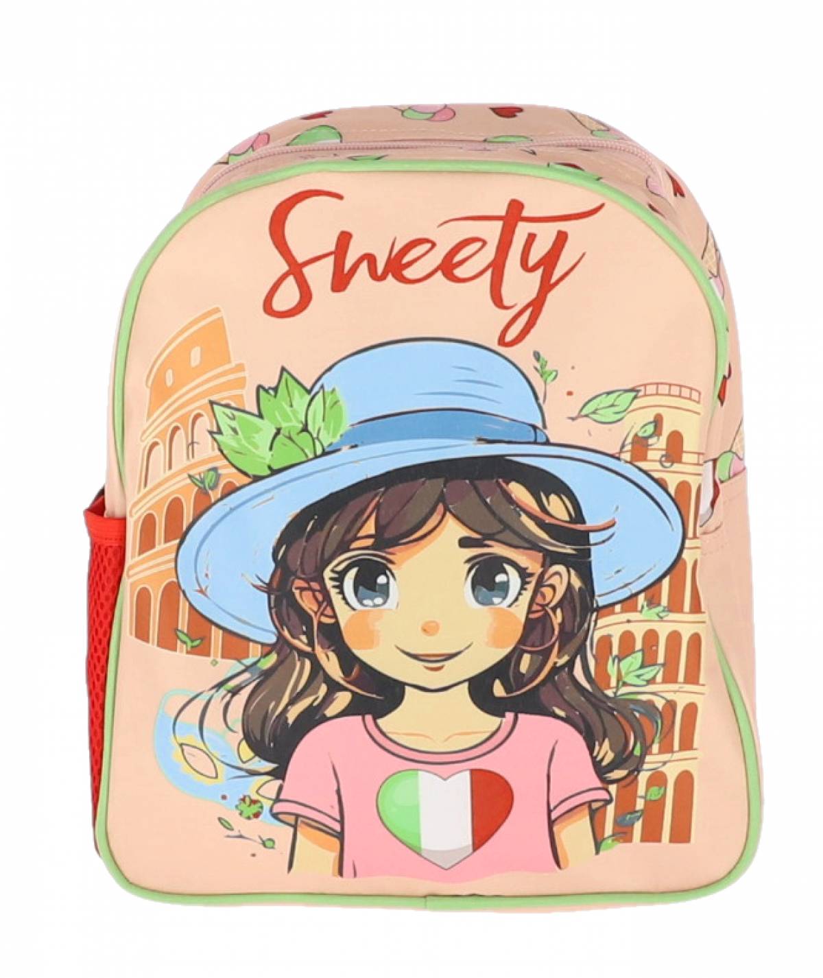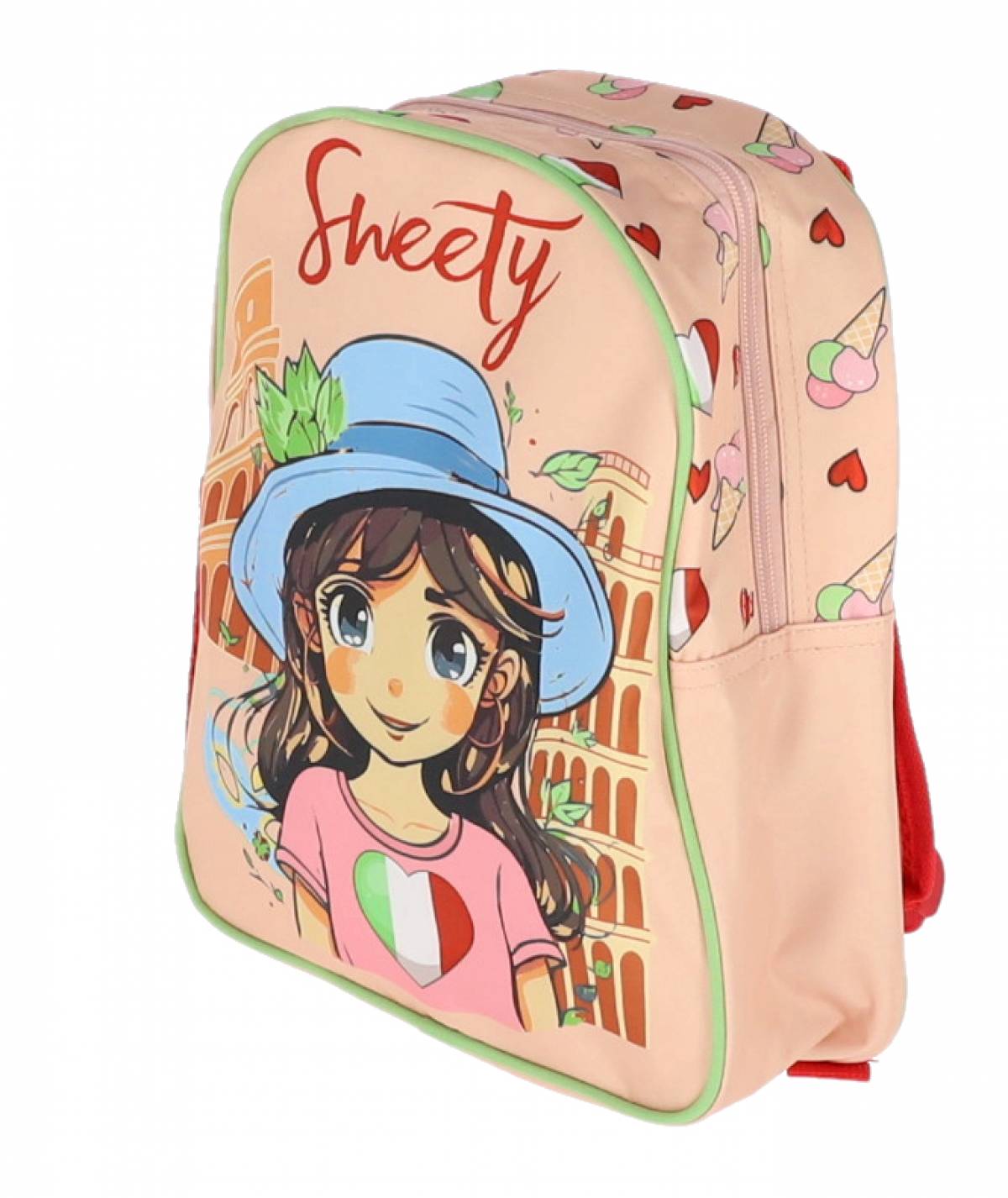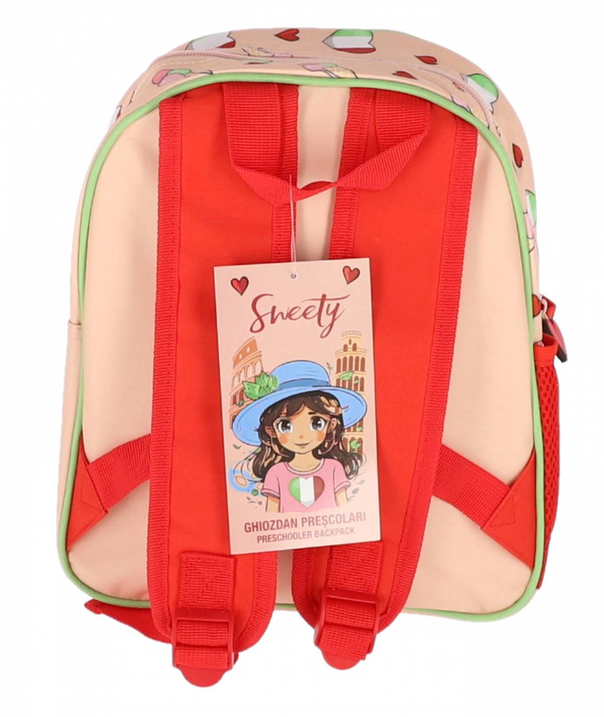 Ghiozdan pentru prescolari din colectia Sweety cu un compartiment, fermoar rosu usor de manevrat. Material moale, usor si confortabil la purtare. Buzunar lateral pentru sticla. Dimensiuni: 28H x 24 x 9 cm.