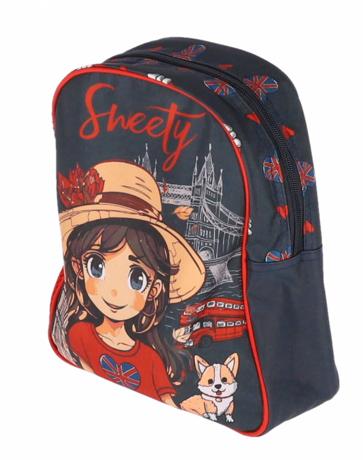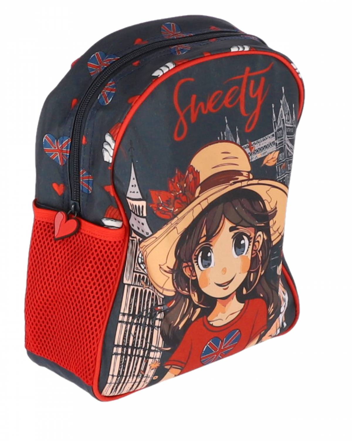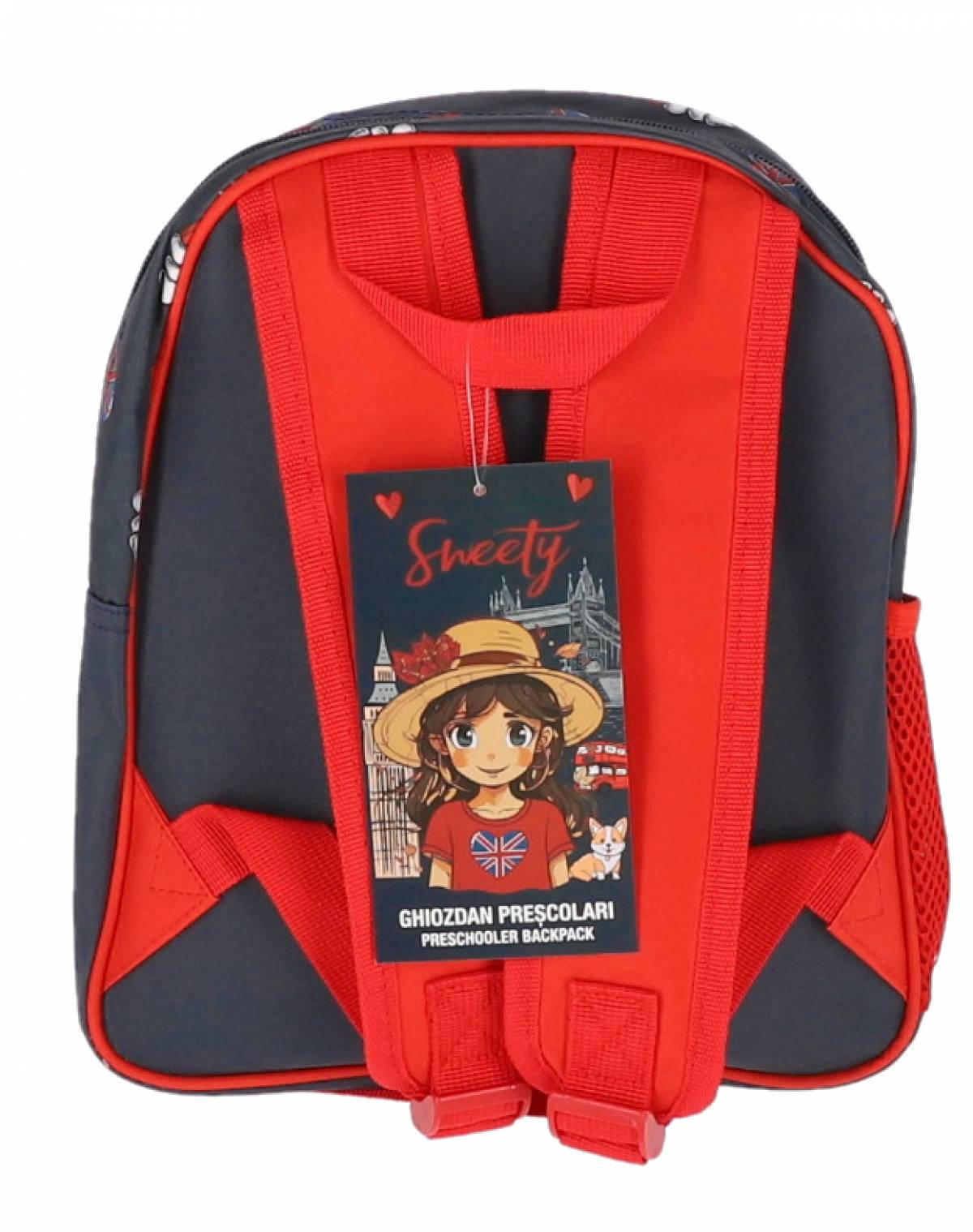 Ghiozdan pentru prescolari din colectia Sweety cu un compartiment, fermoar rosu usor de manevrat. Material moale, usor si confortabil la purtare. Buzunar lateral pentru sticla. Dimensiuni: 28H x 24 x 9 cm.