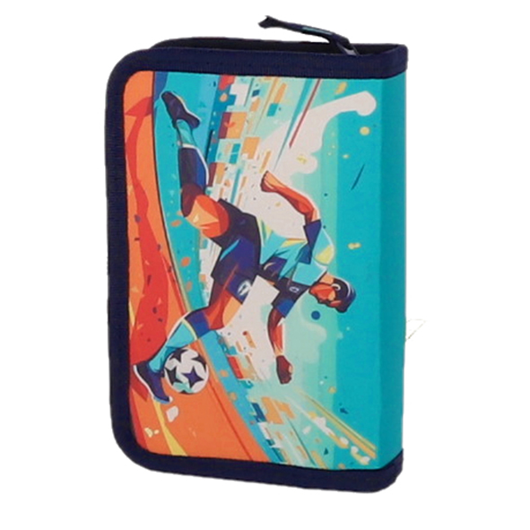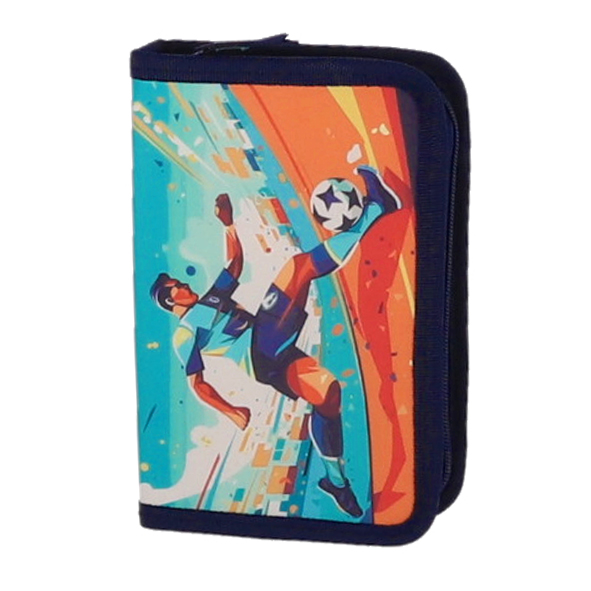 Penar albastru fotbal de la Pigna cu 1 fermoar si 2 extensii, echipat cu 31 piese: 12 creioane colorate, 1 radiera, 1 ascuțitoare, 2 creioane HB cu radieră la capat, 1 rigla de 15 cm, 1 echer, 1 raportor, 3 rezerve cerneala, 6 carioci, 2 orare și 1 pix.