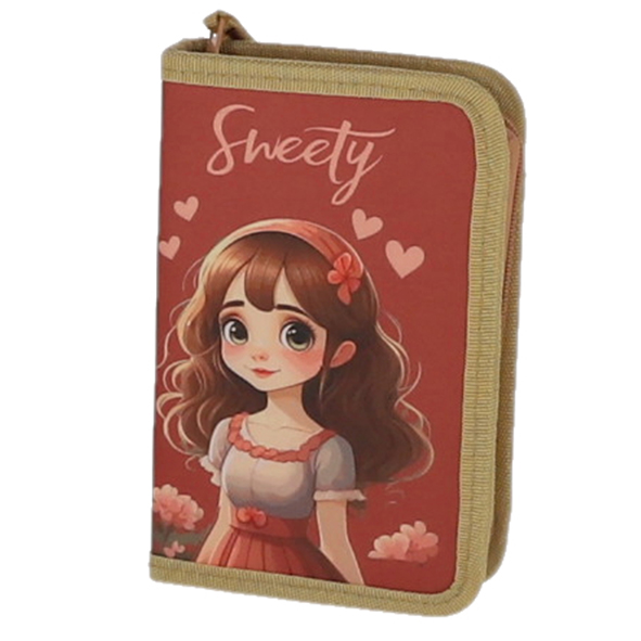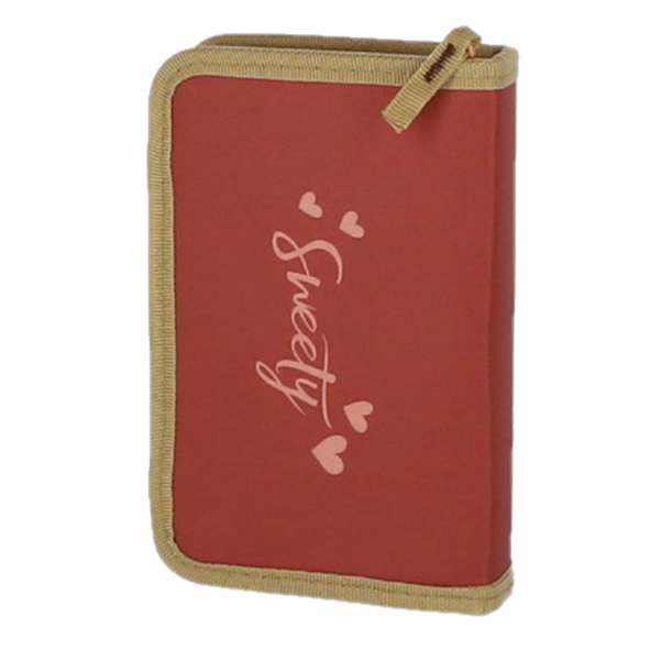 Penar maro Sweety de la Pigna cu 1 fermoar si 2 extensii, echipat cu 31 piese: 12 creioane colorate, 1 radiera, 1 ascuțitoare, 2 creioane HB cu radieră la capat, 1 rigla de 15 cm, 1 echer, 1 raportor, 3 rezerve cerneala, 6 carioci, 2 orare și 1 pix.