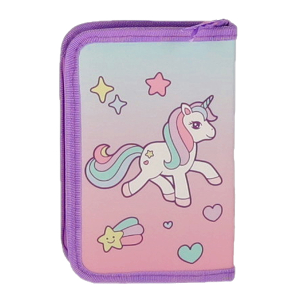 Penar roz Unicorn de la Pigna cu 1 fermoar si 2 extensii, echipat cu 31 piese: 12 creioane colorate, 1 radiera, 1 ascuțitoare, 2 creioane HB cu radieră la capat, 1 rigla de 15 cm, 1 echer, 1 raportor, 3 rezerve cerneala, 6 carioci, 2 orare și 1 pix.