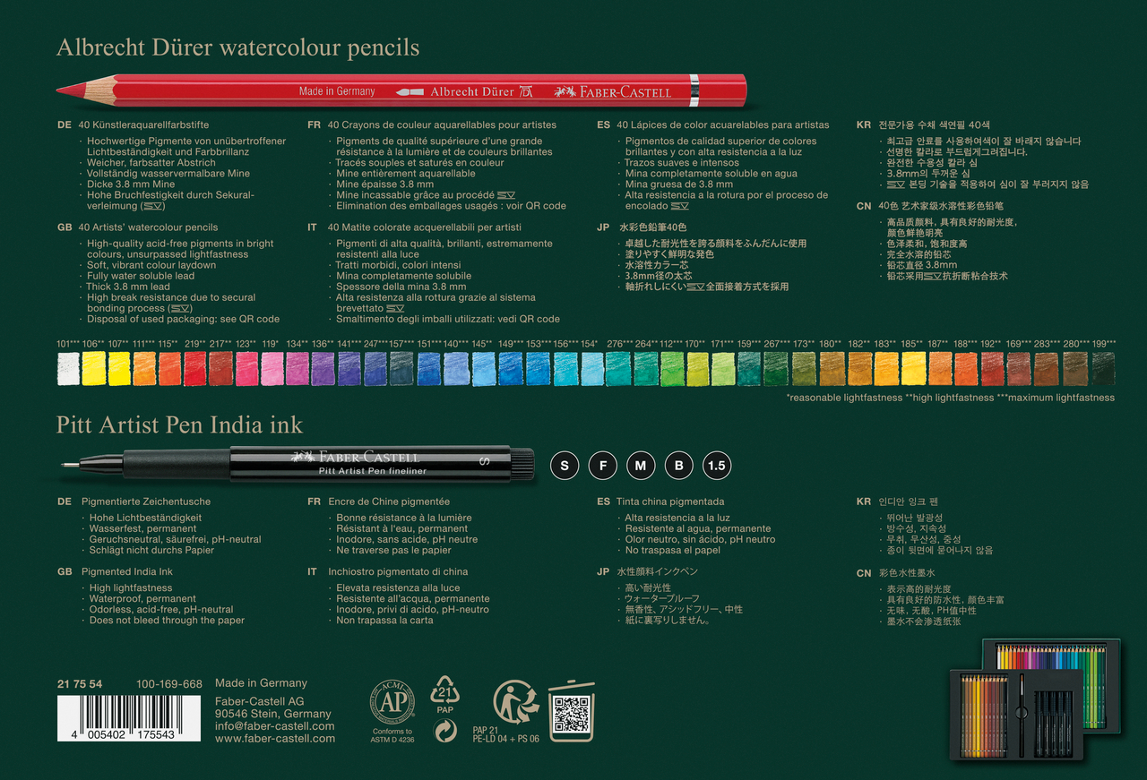 Setul cadou contine 40 creioane colorate tip acuarela Albrecht Durer, 5 markere Pitt Artist Pen cu cerneala pigmentata India, permanenta, rezistenta la lumina si apa, si o pensula pentru tehnici mixte. Creioane cu mina groasa (diametrul 3.8 mm) moale si pigmentata intens. Rezistenta mare la rupere datorita procesului securizat de lipire a minei(SV). Lemnul creioanelor provine din silvicultura sustenabila. Culori intense, aplicare usoara. Cu ajutorul acestui set poti treci cu usurinta de la desen la acuarela cu tranzitii vizuale armonioase.