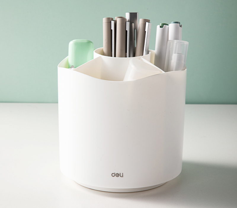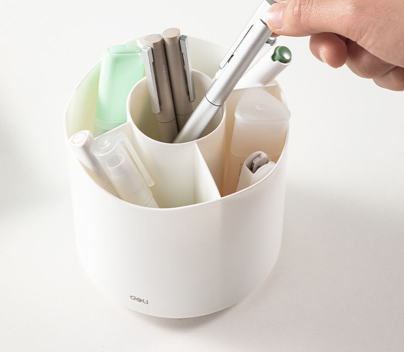 Suport rotativ Deli cu 5 compartimente, pentru instrumente de scris, de culoare alba, realizat din plastic rezistent usor de curatat. Se roteste la 360° facilitand accesul la compartimente. Capacitate mare de stocare. Dimensiuni: 12.3 x 12.3 x 12.4 cm.